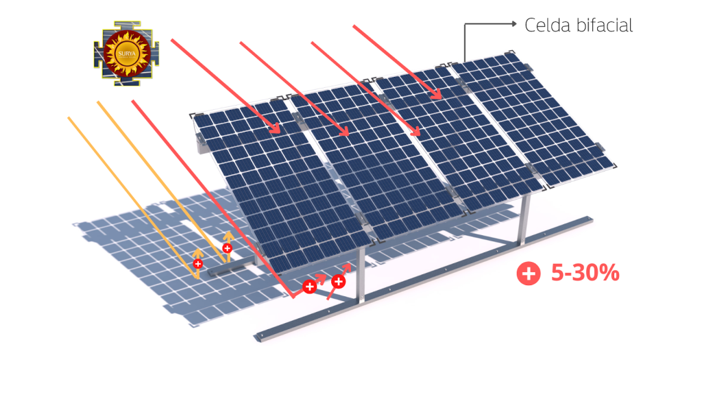Los paneles solares bifaciales tienen un funcionamiento diferente al de los convencionales, ya que cuentan con celdas solares en ambas caras. Es decir, producen electricidad tanto por la parte superior como por la inferior.